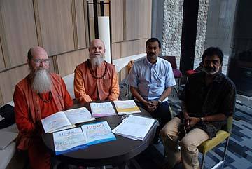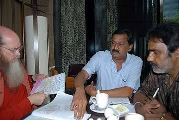 Arumugaswami was lucky enough to be able to meet with our team from Sampoorna Printers based in Malaysia. The nature of the visit was to discuss a current project of Himalayan Academy to produce a series of stories for children entitled, "Modern Hindu Children's Stories." Based on the 10 yamas and 10 niyamas, the stories, though not limited to them, the series of stories elucidates in clear speech the ways in which children can learn Hinduism's knowledge on leading a dharmic life. Selvam (centre) is our project manager at Sampoorna and we're happy to say we've had the delight of working with him for the past several years. Accompanying him was Subramaniam (right), a cheif designer for the company. Our first meeting with him proved enlightening. Subramaniam is highly gifted within his field and provided various samples for cover artwork, layout, design, color coordination, etc.