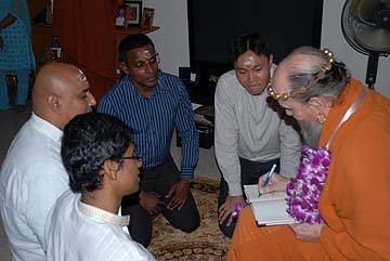 Devotees eagerly awaiting their Master Course Trilogy books to be signed by Bodhinatha.
