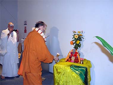 Bodhinatha performs an arati at the small Ganesha Shrine seeking the Lord's Blessings before starting the event of the day.