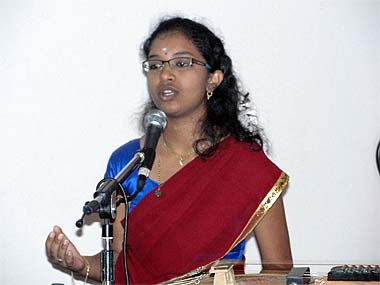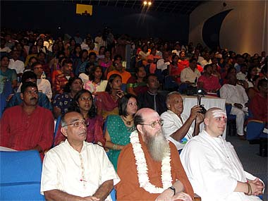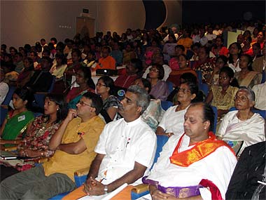 After the end of the first session, just before the coffee break, a group of sishyas came on stage to humbly offer Bodhinatha and the participants a taste of Saivite traditional music. Here is member Padmasree Ramsamy from Henrieta, singing in carnatic a song to Lord Ganapati. Padmasri is only 17, and to what observers say, is very good in carnatic music which she has learnt since her childhood at the Indira Gandhi Cultural Centre, run by the Government of India, in Mauritius.
