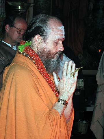Then we gave a small dish of prasadam and twenty rupees dakshina to a few hundred sadhus. This is a daily practice of the mutt which gives to some twenty groups a day totaling over 1,500 sadhus daily. Next we attended the morning satsang period. Avdeshananda was at a opening nearby of a new building of Swami Ram Dev so the main talk was given by Swami Muditvadanananda plus they let us speak for some thirty minutes including Rajiv's translation on our Hawaii monastery activities.