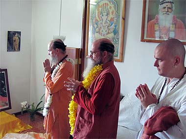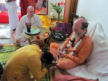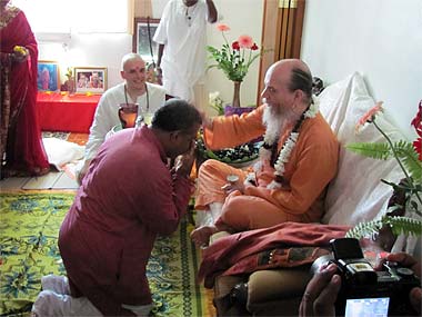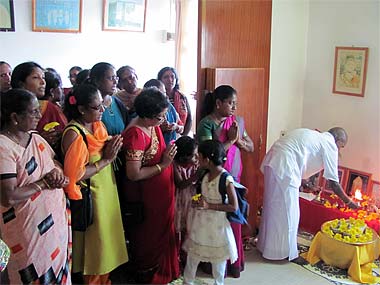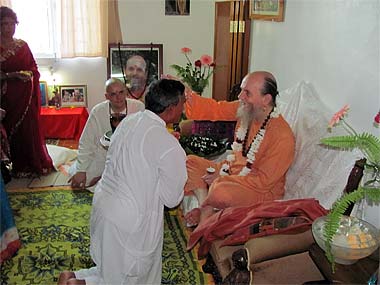 Brah. Vel performing arati in his home shrine to welcome the Guru.
