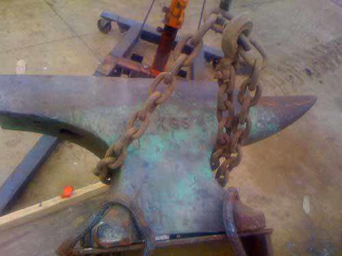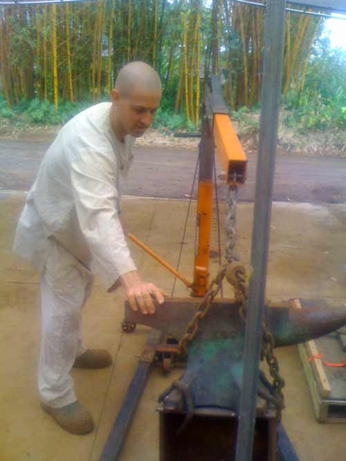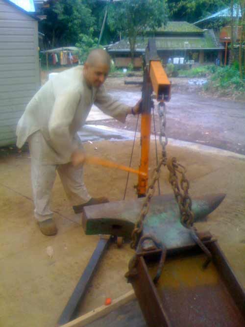 Deva Rajan has been working with Sadhaka Tejadevanatha for several months to acquire an anvil for the monastery's metal working needs. After searching high and low Deva's son Kailash located a 180lb England Anvil at the local community College in Concord, California.