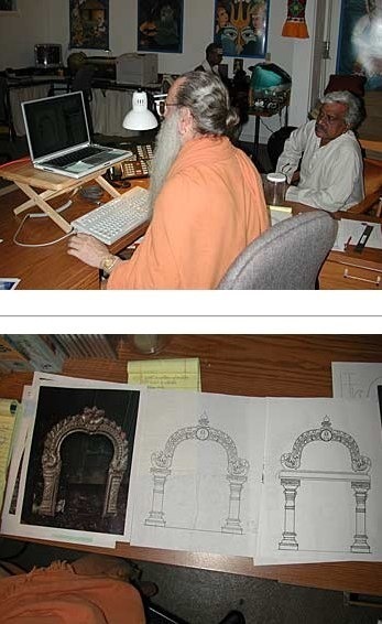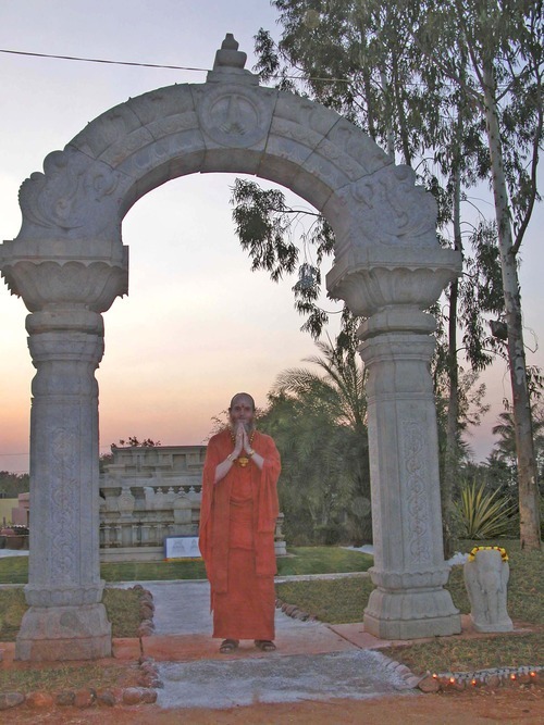 Years ago Gurudeva asked for a formal gate to be carved, a new entrance to the monastery. It was carved in India, and for about two years it stood, completed, at our worksite in Bengaluru. Here Bodhinatha stands under it in India.