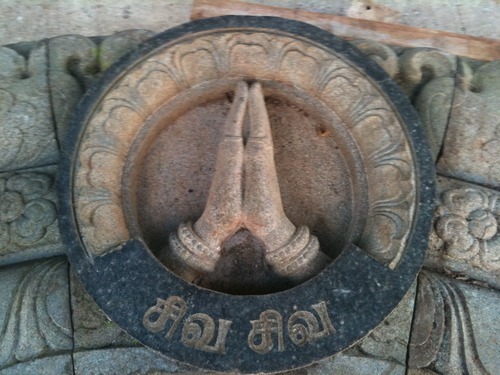 A close up of the Namaste hands at the top of the gate, with Siva Siva carved in Tamil. It will be a wonderful entrance for future pilgrims.