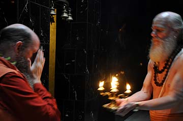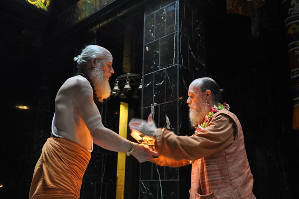 An arati is performed at the temple, alerting the Gods and the Devas that the travelers have returned.