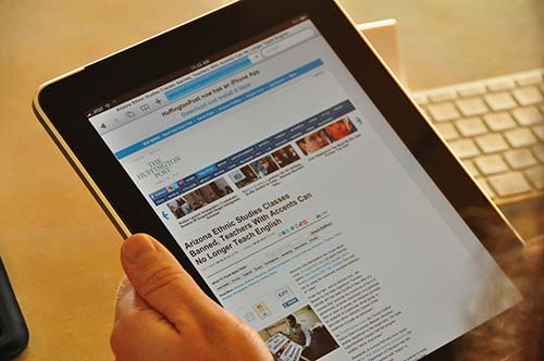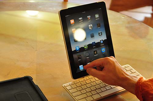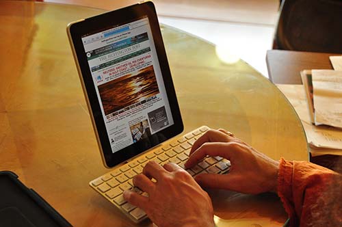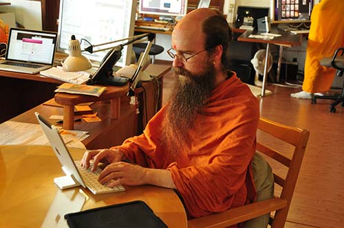The monastery's development iPad arrived at the Ganapati Kulam, a donation from one of our TAKA viewers who wanted to contribute to keeping our publications team on the leading edge of the digital revolution. Senthilnathaswami tests it out in a dock with a keyboard. Marvelous!