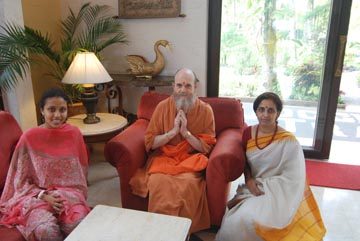 Meeting with Choodie Shivaram, Hinduism Today's Bangalore correspondent, and her daughter at the Golden Palms hotel.