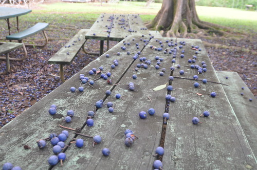 They are falling on the picnic tables. Everywhere. Quite a sight!