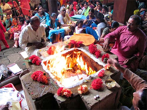 The huge flames of the homa consuming hundreds of prayers, mainly prayers from devotees which will eventually reappear in the inner worlds for the inner beings to handle.