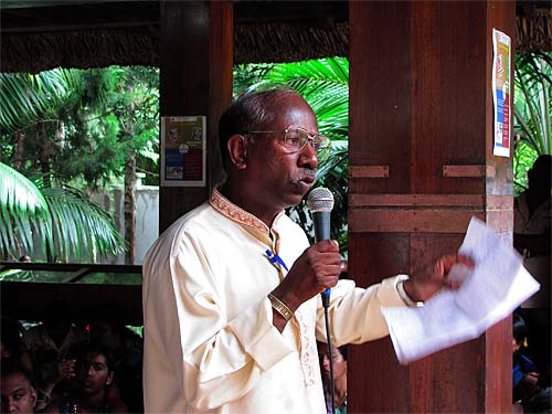 Kulapati Siven Koothan giving a talk from Satguru Bodhinatha Veylanswami's teachings. One of the quotes concluding the talk was: "Do not live in the darkness of the past but live in the light of the present.".