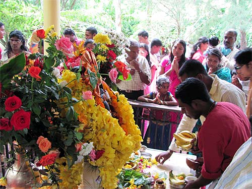 Aum Shri Gam Ganapataye Namah! Lord Pancha Mukha Ganapati majestically decked with home made garlands and flowers at the Spiritual Park of Mauritius. The ceremony was attended by some three thousand devotees on that Sunday rainy morning.