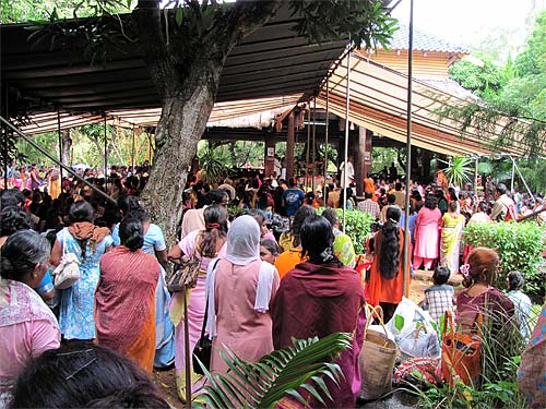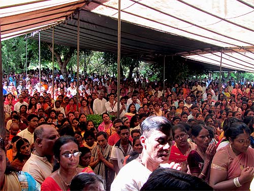 The rain stopped, just at the time when the ceremony was at its peak. Here we see devotees standing meters away from the Mandapam where the homa is being conducted.