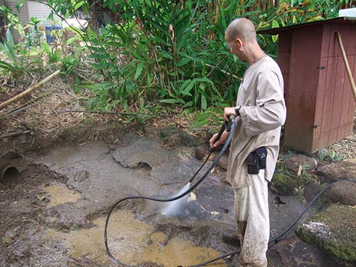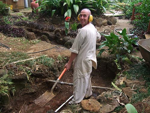 A huge job! Sadhaka Nilakantha digging out mud with ear-muffs on to protect the ears from the noise of the jack hammer and pressure washer.