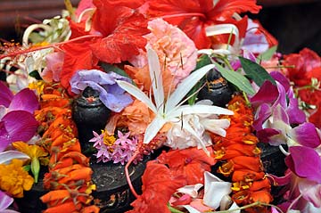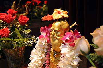Flowers adorn the guru's feet. We follow his steps to our true, inner Self.