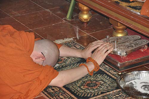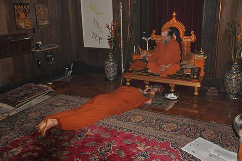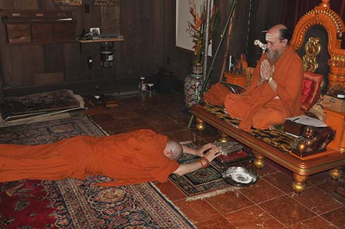 He prostrates three time before his initiating Satguru Bodhinatha Veylanswami.