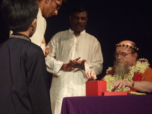 Bodhinatha gave vibuthi to all those present after the seminar. He also signed many books, including 135 of Gurudeva's Spiritual Visions. Here Bodhinatha blesses a small murthi of Gurudeva. Kulapati Balu Sivaceyon (center) stands by and assists.