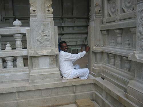 It is a special treat to see the silpis actually at work on the temple. Here Silpi Kannan finishes the last course of the beautiful railing!