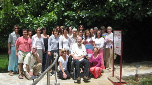 June 3, 2010Kim Lynn, standing center of photo, and Scott Moore, back row center, brought a group of twenty participants of a Hatha Yoga seminar on Kauai this week. They are instructors at Centered City Yoga in Salt Lake City, Utah. Upon arrival before heading to their retreat center in Hanalei, the visited Kauia's Hindu monastery for a tour of the grounds and to see Iraivan Temple. They were very fortunate to have a lovely upadesh with Paramacharya Palaniswami. He shared the recent news of the controversy posted on Huffington Post in which Hatha Yoga should be acknowledged for it's Hindu roots or that this is not an important factor for teachers and participants to consider in the billion dollar business that Hatha Yoga has become. Check out the recent post on HPI.