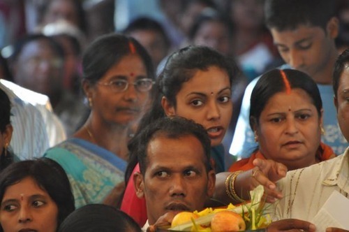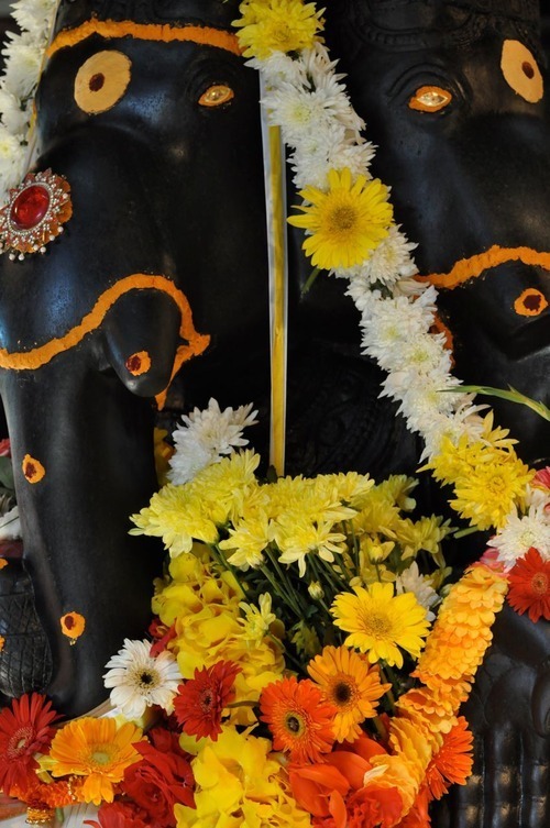 June 7, 2010Each month at our Spiritual Park in Mauritius, just off the coast of South Africa, over 3,000 of Lord Ganesha's favorite devotees come for darshan. Here we see two of His five faces, decorated with sandalwood paste and flowers.