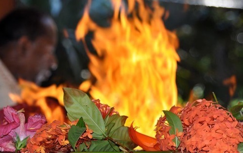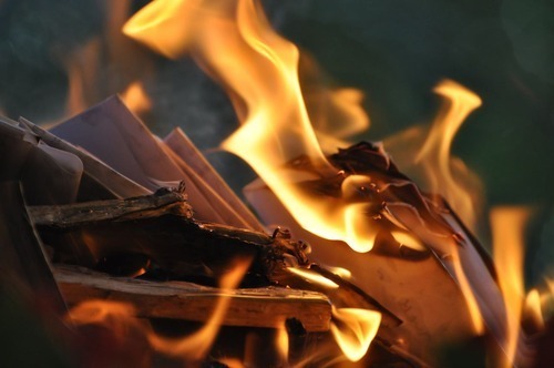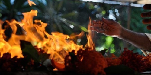 (The priest offers the written prayers into the sacred flames) "No one is going to clean it up until one of us takes responsibility and says, "I'm sorry I dropped the plate of rice and curry," and gets down on hands and knees and cleans it up. In the same way, only by taking responsibility, by recognizing what we have done as our own doing, can we begin cleaning up the results of our actions."
