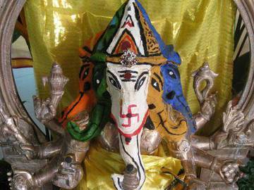 The temple Gurukkal made a Panchamukha Ganapati with chandanam paste and gave each face a distinct color, one for each day of the festival. Amazing work!