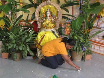 One of our intrepid team members begins the kolam decoration on the floor in front of the shrine.