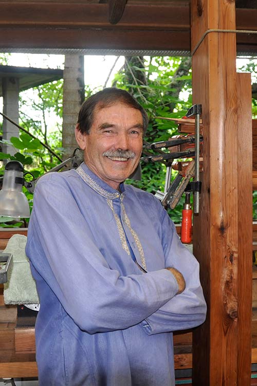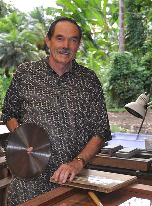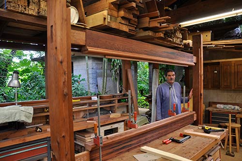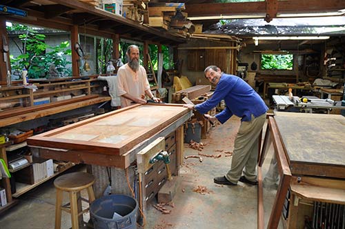 Deva Rajan stops for a moment at the front entry of the wood shop, having just cleaned up a special, fine-tooth blade we used for a critical cut, before putting the blade away for safe keeping. You can see the water stone sharpening station on the right, the place where all plane and chisel blades are brought to a razor edge.