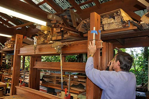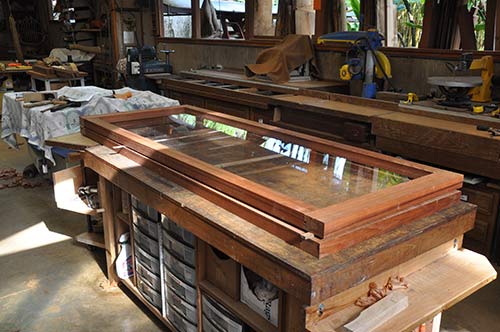 It is all being made with clear redwood. Here Deva is cutting the end of a stopped notch on the three frames that will hold digital copies of the mural art being created in Kerala. The long stretcher pieces are on the bench in the background. Deva comes to Kauai two or three times each year to work on the project with Acharya Kumarswami. The monastery woodworking shop is a contemporary blend of power tools and hand tools, including superb Japanese and Western planes, chisels and saws.