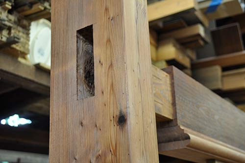 The building material is all old-growth redwood that was salvaged by Deva's construction crew about ten years ago from a retired water tower in northern California. The tank was 50 feet in diameter, made of clear 3"x8" x 20-foot pieces. Here Deva is tapping in the wedges that will secure the tenons. Notice the come-along the team used to pull the posts together to make a joint so snug that it can be a home for elementals. The wedges are made from Monterey Cyprus wood harvested in Kokee and milled at the monastery.