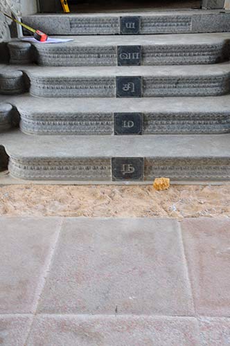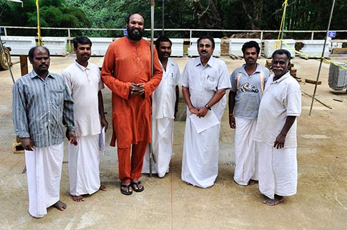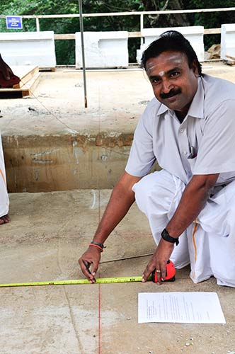 We are blessed to have our chief architect here on site with us for a few days: Selvanathan Sthapati. He is working with Yoginathaswami and the silpis laying out the Nandi Mandapam work in detail.
