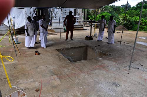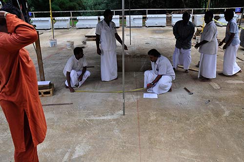 By this we mean the center line of Iraivan temple. This had been marked long before but with the roof on, and all the floor completed and scaffolding removed, Sthapati wanted to check and re-check, to ensure that Nandi and the Kodimaram would be precisely aligned with the inner sanctum.