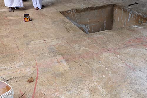 In the center the pit has been dig completely through the compacted gravel into the earth. Here is where the Kodimaram will be connected directly to the ground underneath the cement foundation.