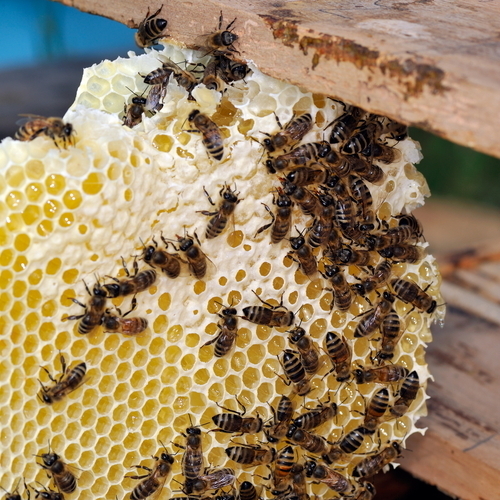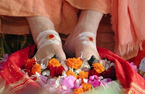 During pada puja to the satguru's feet, we offer all that is precious to the One. The bees collect watery nectar from a million flowers and in the hive's dark chamber patiently concentrate it into honey. In offering honey to the guru's feet, the world of insects worships the One.