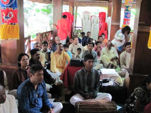 Everyone is immersed in the worship of the Guru during the pada puja.