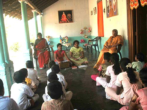 A teacher, well trained in Pannisai, Selvi Sivayogarani, has begun teaching the Kottam children. First they will learn the songs from the Natchinthanai book created by Kauai Aadheenam, and then they will continue learning additional songs.