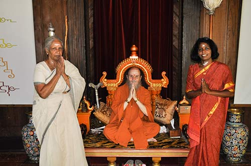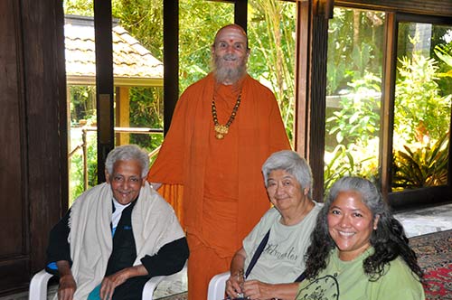 Balambagai Rasanayagam, from UK, and her daughter Vasuhi from Deleware. Balambagai met Yogaswami at Nallur Temple when she was a young girl and received his blessings at his ashram in Columbuturai. The met with the swamis and talked with Sivakatirswami about ways to get Yogaswami's Natchintanai over to the next generation.
