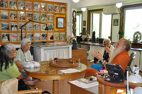 Nana Bhattacharya, his wife Phyllis and daughter Swasti meet with Bodhinatha. Mr. Bhattacharyya worked for Mahatma Gandhi in the 1940's in his Education Program in Maharashtra. His wife was from Japan and traveled to India as a registered nurse to help at the Gandhi's Sevagram Hospital. Swasti is an Assistant Professor in Religion at Buena Vista University in Iowa.
