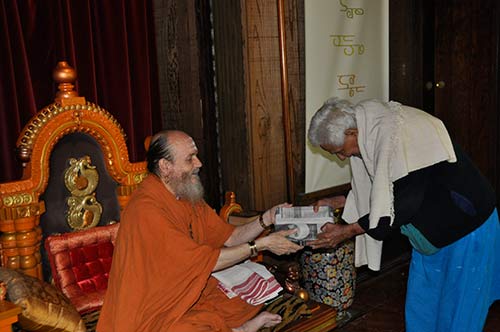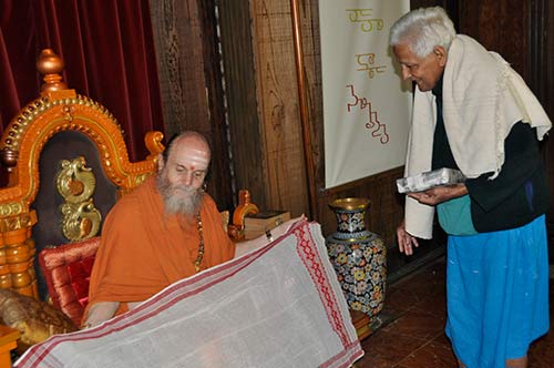 Nana gives handwoven cloth art work to Bodhinatha.