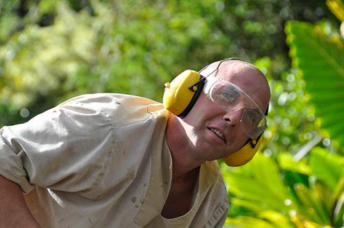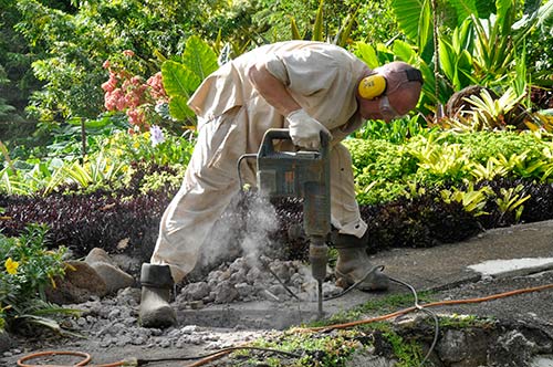 Sadhaka Nilakantha is opening up the space between the side walk and the pool edge. Underneath we are finding a lot of open spaces around the pool which is really just like a thin bowl sitting in space as erosion has removed soil from underneath it. Now is the time to fix this.