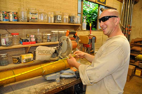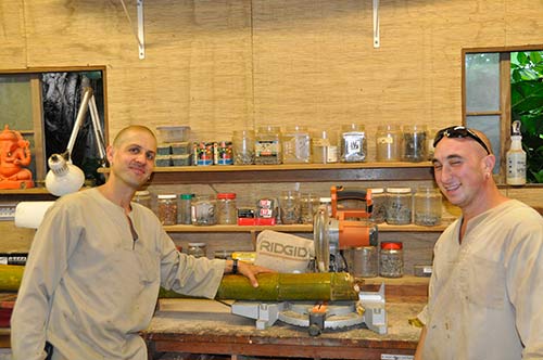 Sadhaka Tejadeva and Sadhaka Rajanatha are working on bamboo safety railings for this temporary installation.
