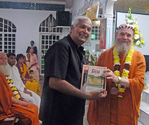Before his presentation at the Edinburg Hindu Temple in Chaguanas on August 18th, Bodhinatha greets the acting Prime Minister of Trinidad and Tobago, Mr. Winston Dookeran, and gives him a copy of Gurudeva's Dancing with Siva and Hinduism Today.