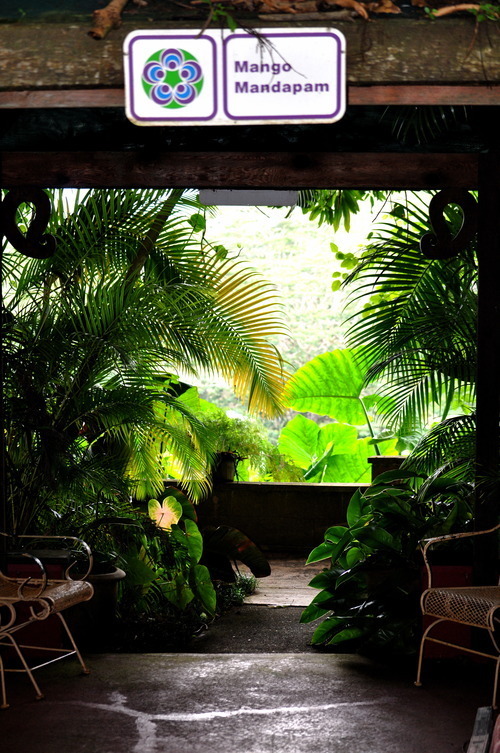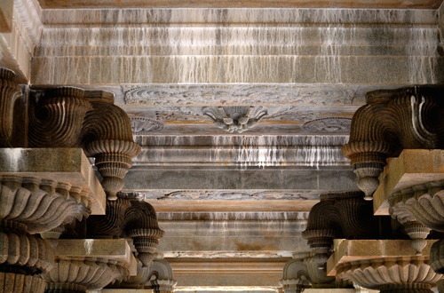 Into an ancient temple. Oops, that Iraivan, not so ancient, but looking that way from the lime that is seeping from the concrete that was poured to make the roof waterproof. It will be removed later.