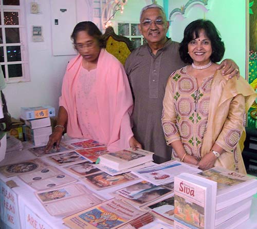 Jai and Chandra Seecharan at the Hinduism Today display at the Edinberg Hindu Temple on the last night of lectures. Together with them is Merl, one of Hinduism Today's loyal helpers in Trinidad