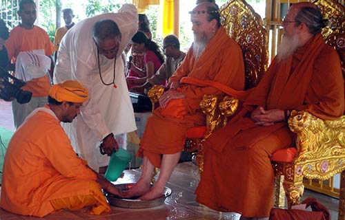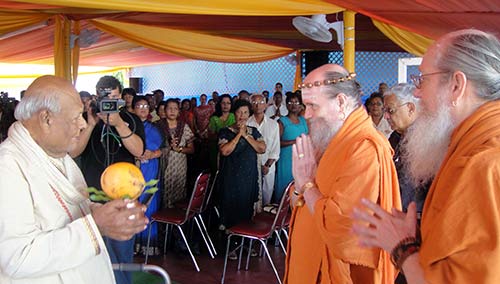 Saturday August 21, Pundit Lutchmee Persad greets Bodhinatha with the traditional exchange of Kalash.