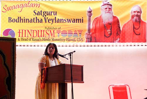 Ashwinee looks on at the guru pujan to the back drop of the welcome banner for Bodhinatha. She did a great deal to make Bodhinatha's visit a great success.