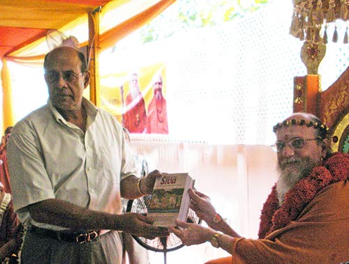 After the talk, Bodhinatha presents a hard cover copy of Dancing With Siva to the Minister.