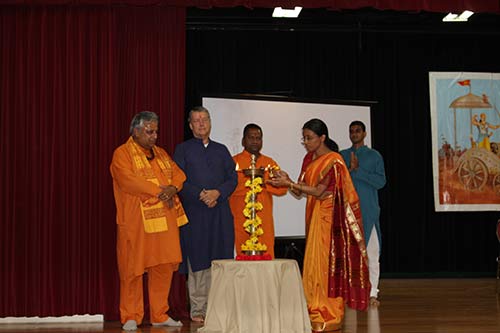 The Dharma Sabha in typical Hindu tradition welcomed the attendees by applying vermillion on the forehead and commenced with blowing of the conch shell by the compere, Mrs. Mrunal Nanivadekar, followed by recitation of Vedic mantras by the Temple priests and lighting of the auspicious oil lamp by the Dharma Sabha speakers. It received generous support from the Sunnyvale Hindu community, who contributed towards the refreshments, technical support, publicity and other aspects of the Dharma Sabha. These inspiring contributions were commemorated in a beautiful, visual souvenir that illustrated the unique science underlying Hindu practices and highlighted issues such as denigration and persecution of Hindus. The souvenir was published with the Hindu ritual of ‘prakaashan' at the hands of the main speaker of the Dharma Sabha, Shri. Easan Katir, who is performing and promoting spiritual practice according to Hinduism for the last 30 years in California.