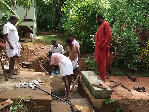 Mixing mortar by hand and wiggling the stone into place with a bar. The placement and leveling of these foundation stones are mission critical for the arch. Stay tuned as the project progresses to a beautiful now entry to Kauai Aadheenam.