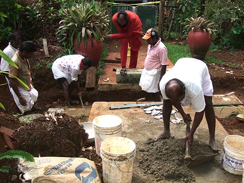 Some of our local concrete worker friends came on August 1st to pour a concrete and rebar foundation for the new entrance archway. It's just behind the Nepali Ganesha shrine.